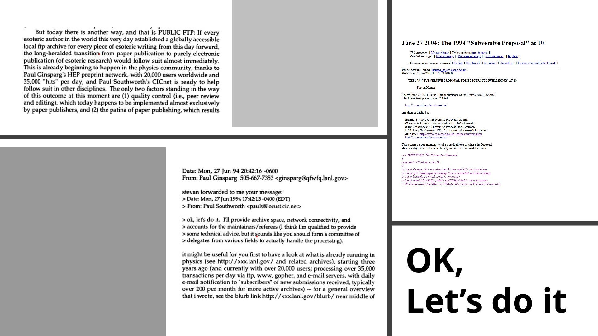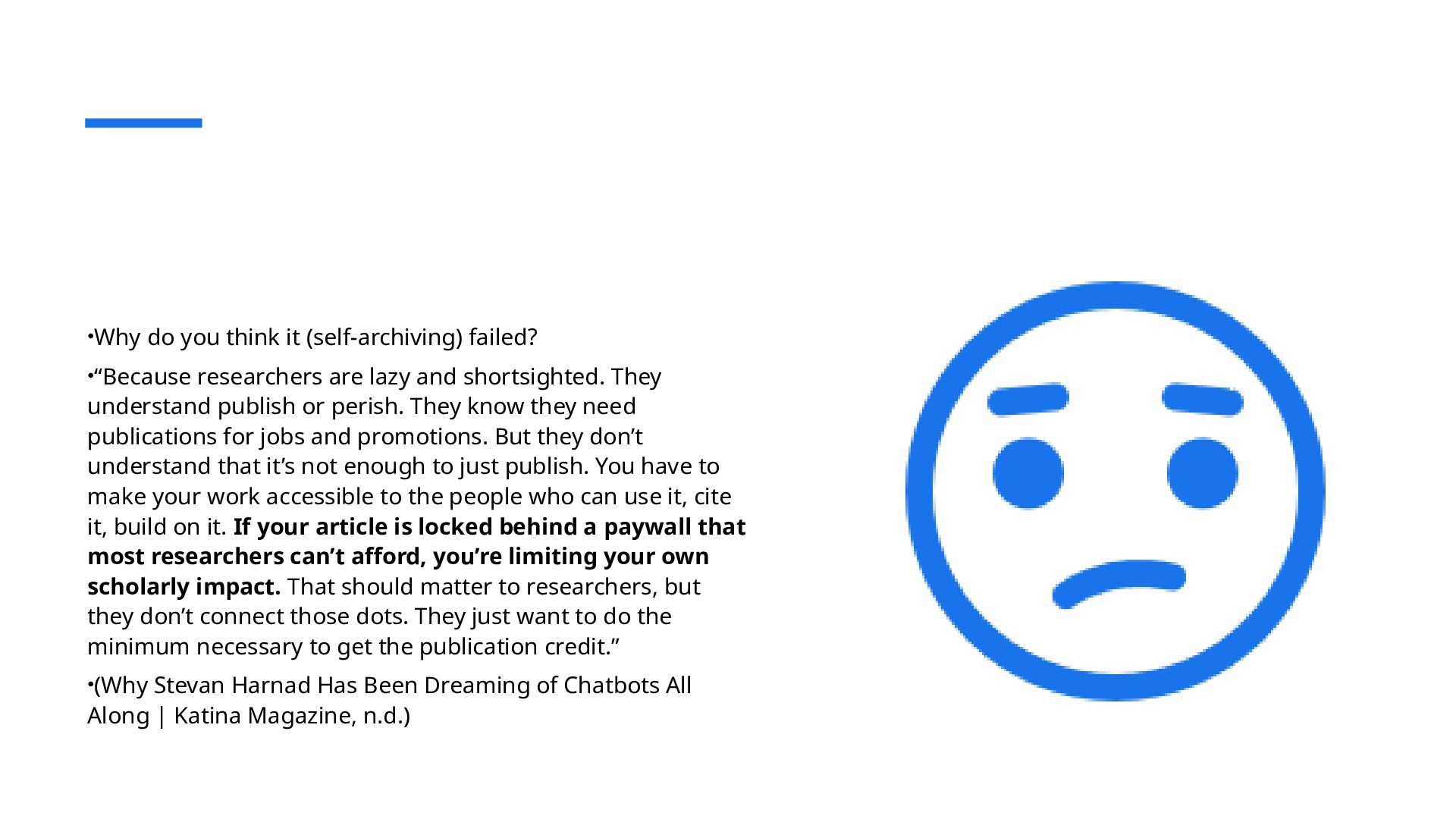 lazy and shortsighted. They understand publish or perish. They know they need publications for jobs and promotions. But they don’t understand that it’s not enough to just publish. You have to make your work accessible to the people who can use it, cite it, build on it. If your article is locked behind a paywall that most researchers can’t afford, you’re limiting your own scholarly impact. That should matter to researchers, but they don’t connect those dots. They just want to do the minimum necessary to get the publication credit.” •(Why Stevan Harnad Has Been Dreaming of Chatbots All Along | Katina Magazine, n.d.)