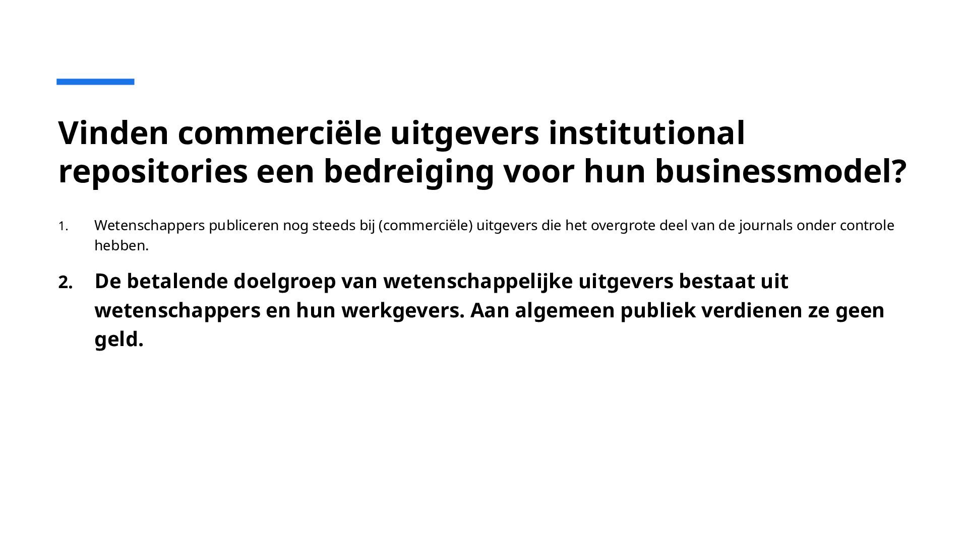 1. Wetenschappers publiceren nog steeds bij (commerciële) uitgevers die het overgrote deel van de journals onder controle hebben. 2. De betalende doelgroep van wetenschappelijke uitgevers bestaat uit wetenschappers en hun werkgevers. Aan algemeen publiek verdienen ze geen geld.