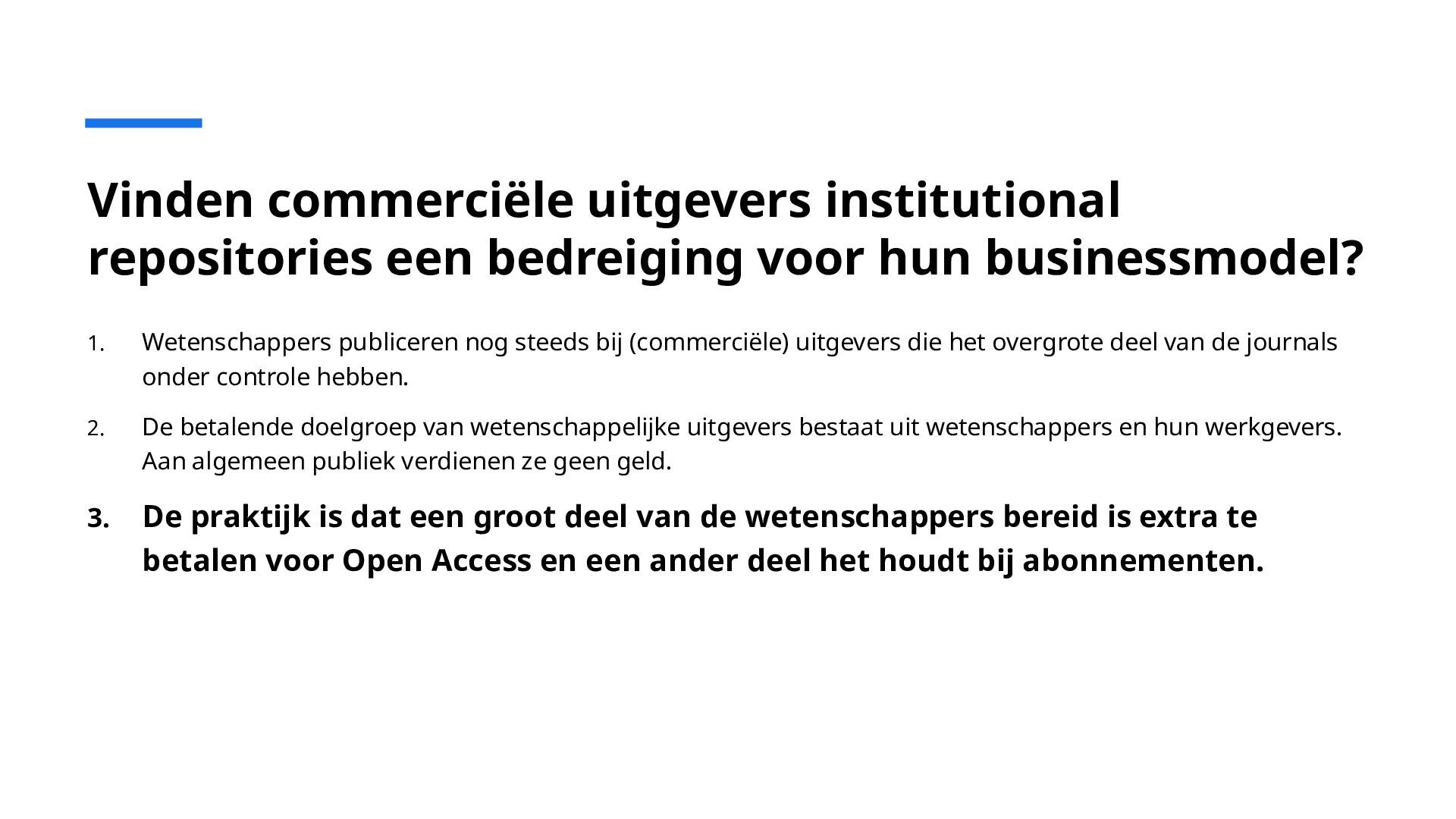 1. Wetenschappers publiceren nog steeds bij (commerciële) uitgevers die het overgrote deel van de journals onder controle hebben. 2. De betalende doelgroep van wetenschappelijke uitgevers bestaat uit wetenschappers en hun werkgevers. Aan algemeen publiek verdienen ze geen geld. 3. De praktijk is dat een groot deel van de wetenschappers bereid is extra te betalen voor Open Access en een ander deel het houdt bij abonnementen.