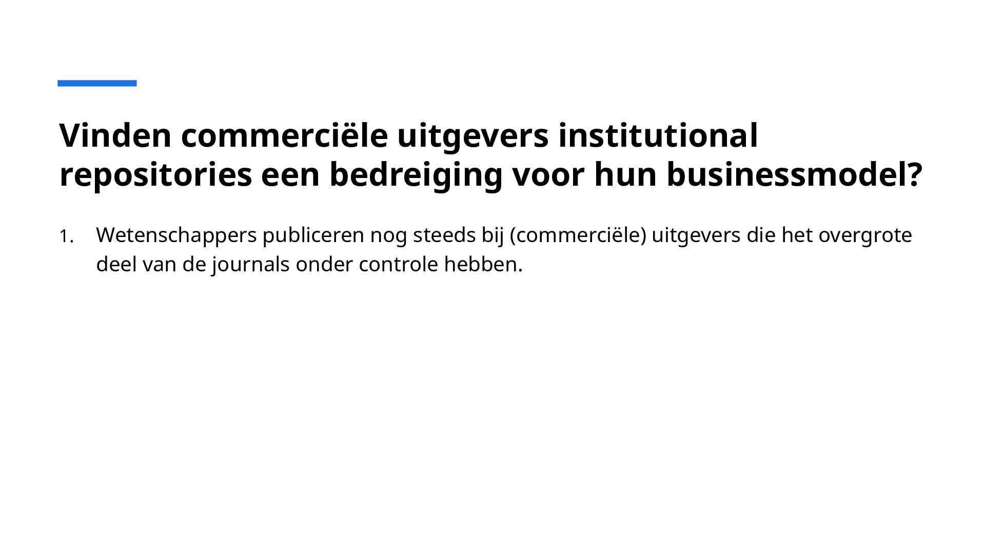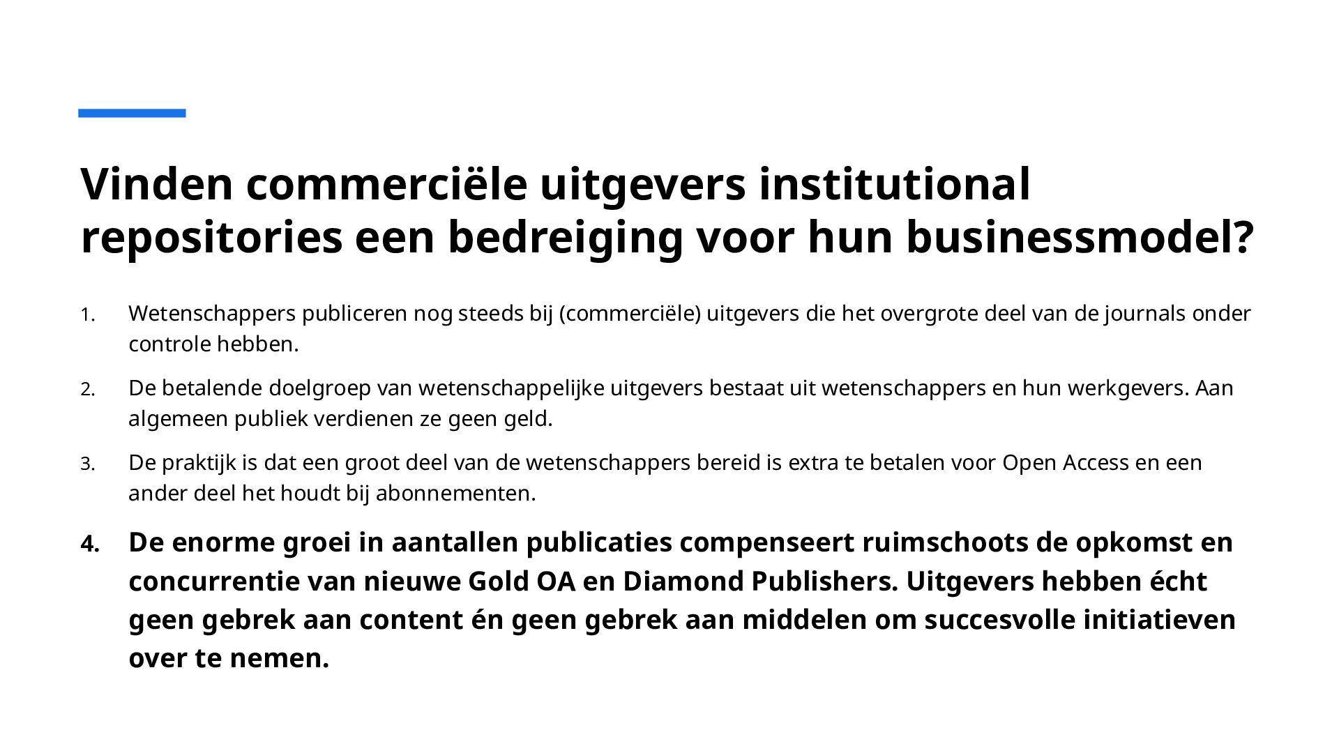 1. Wetenschappers publiceren nog steeds bij (commerciële) uitgevers die het overgrote deel van de journals onder controle hebben. 2. De betalende doelgroep van wetenschappelijke uitgevers bestaat uit wetenschappers en hun werkgevers. Aan algemeen publiek verdienen ze geen geld. 3. De praktijk is dat een groot deel van de wetenschappers bereid is extra te betalen voor Open Access en een ander deel het houdt bij abonnementen. 4. De enorme groei in aantallen publicaties compenseert ruimschoots de opkomst en concurrentie van nieuwe Gold OA en Diamond Publishers. Uitgevers hebben écht geen gebrek aan content én geen gebrek aan middelen om succesvolle initiatieven over te nemen.