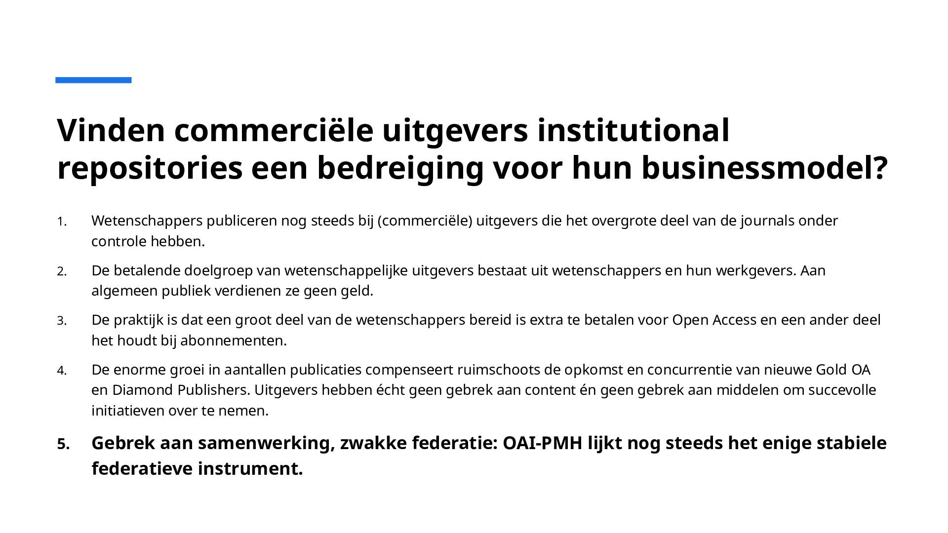 1. Wetenschappers publiceren nog steeds bij (commerciële) uitgevers die het overgrote deel van de journals onder controle hebben. 2. De betalende doelgroep van wetenschappelijke uitgevers bestaat uit wetenschappers en hun werkgevers. Aan algemeen publiek verdienen ze geen geld. 3. De praktijk is dat een groot deel van de wetenschappers bereid is extra te betalen voor Open Access en een ander deel het houdt bij abonnementen. 4. De enorme groei in aantallen publicaties compenseert ruimschoots de opkomst en concurrentie van nieuwe Gold OA en Diamond Publishers. Uitgevers hebben écht geen gebrek aan content én geen gebrek aan middelen om succevolle initiatieven over te nemen. 5. Gebrek aan samenwerking, zwakke federatie: OAI-PMH lijkt nog steeds het enige stabiele federatieve instrument.