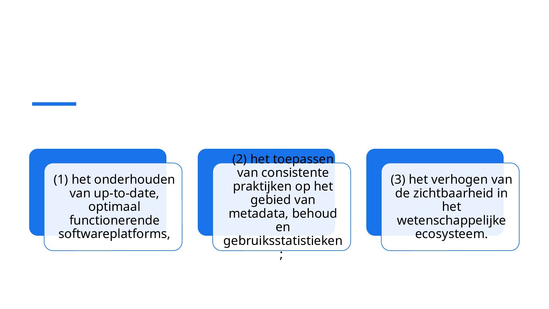 toepassen van consistente praktijken op het gebied van metadata, behoud en gebruiksstatistieken ; (3) het verhogen van de zichtbaarheid in het wetenschappelijke ecosysteem.