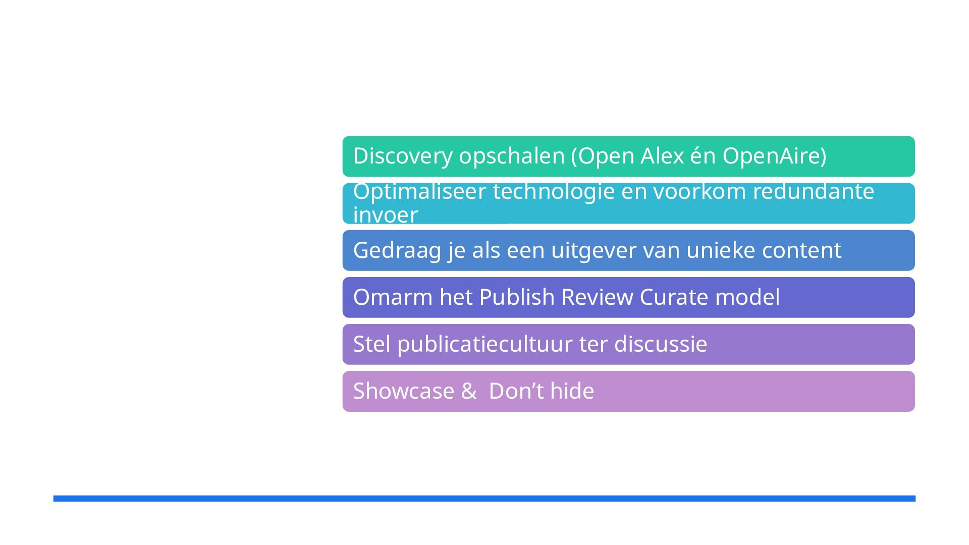redundante invoer Gedraag je als een uitgever van unieke content Omarm het Publish Review Curate model Stel publicatiecultuur ter discussie Showcase & Don’t hide