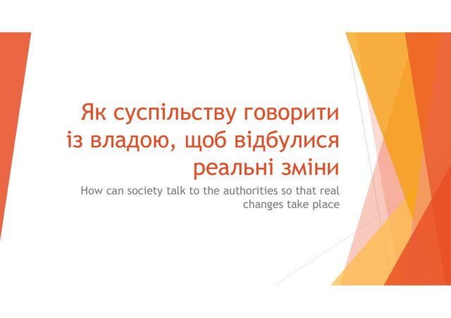 hearing? Їй це не потрібно, влада сама ставить собі завдання і сама їх виконує It does not need it, the government sets its own tasks and fulfills them Окремі голоси, навіть якщо їх багато, не є істиною Individual voices, even if they are many, are not the truth Більшість засобів зв’язку з владою працюють навпаки Most means of communication with the authorities work the other way around