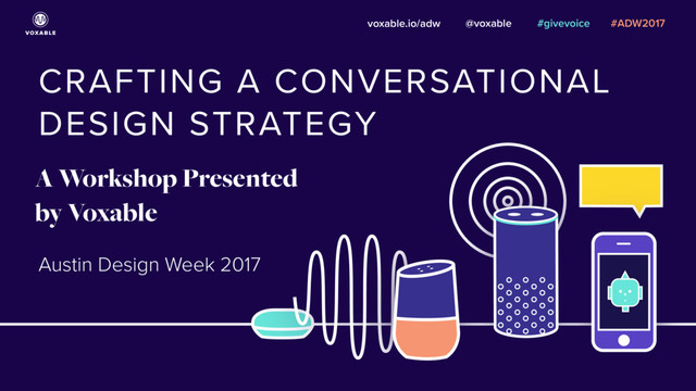 A workshop presented by Voxable for Austin Design Week 2017. In this workshop, you’ll gain an understanding of how conversational interfaces work and how to implement a design strategy for building great conversational experiences. We’ll design an example conversational interface and complete exercises that will guide you through a process you can incorporate into your own design practice.