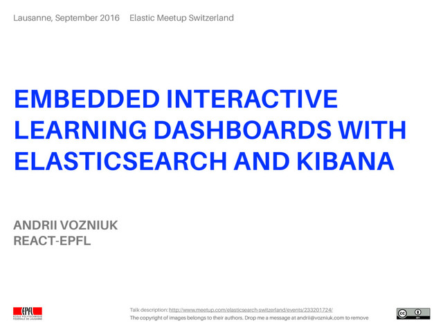 The React Group at EPFL conducts research and development in the field of interaction systems with particular focus on educational technology and learning analytics. Making sense of growing educational data requires deployment and usage of appropriate scalable, real-time processing tools supporting a flexible data schema, such as Elasticsearch. Until recently, the exploitation of Elasticsearch for learning analytics purposes by practitioners was hindered by a high entrance barrier due to the complexity of the query language and the query specificities. This is changing with the ongoing development of Kibana, an open-source tool that allows to conduct analysis, build visualisations of Elasticsearch data through a graphical user interface and combine those visualisations into dashboards. This feature is particularly important since learning dashboards are a popular mean of obtaining insight into the educational data by presenting an aggregated view of different learning indicators on a single display.