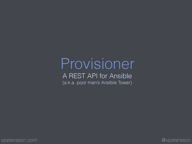 Net Enables a Global Docker Cluster with OnApp” (https://www.weave.works/weave- global-docker-cluster/) • This deck (https://speakerdeck.com/vpetersson/ provisioner-at-ansible-london) @vpetersson vpetersson.com