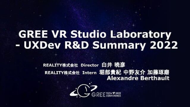 GREE VR Studio Laboratory - UXDev R&D Summary 2022 REALITY株式会社 Director 白井 暁彦 REALITY株式会社 Intern 堀部貴紀 中野友介 加藤琢磨 Alexandre Berthault