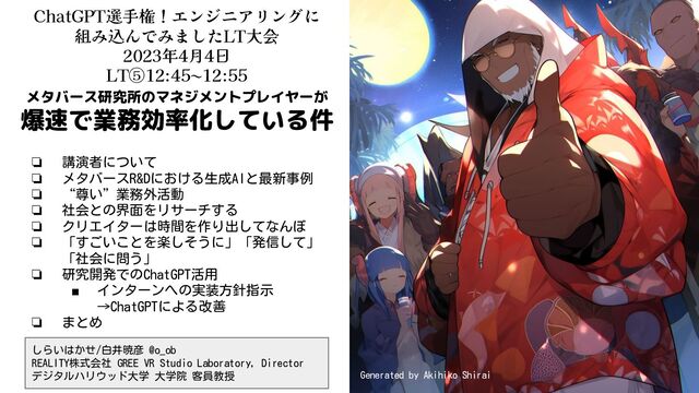ChatGPT選手権!エンジニアリングに組み込んでみましたLT大会 2023年4月4日LT⑤12:45~12:55 メタバース研究所のマネジメントプレイヤーが爆速で業務効率化している件