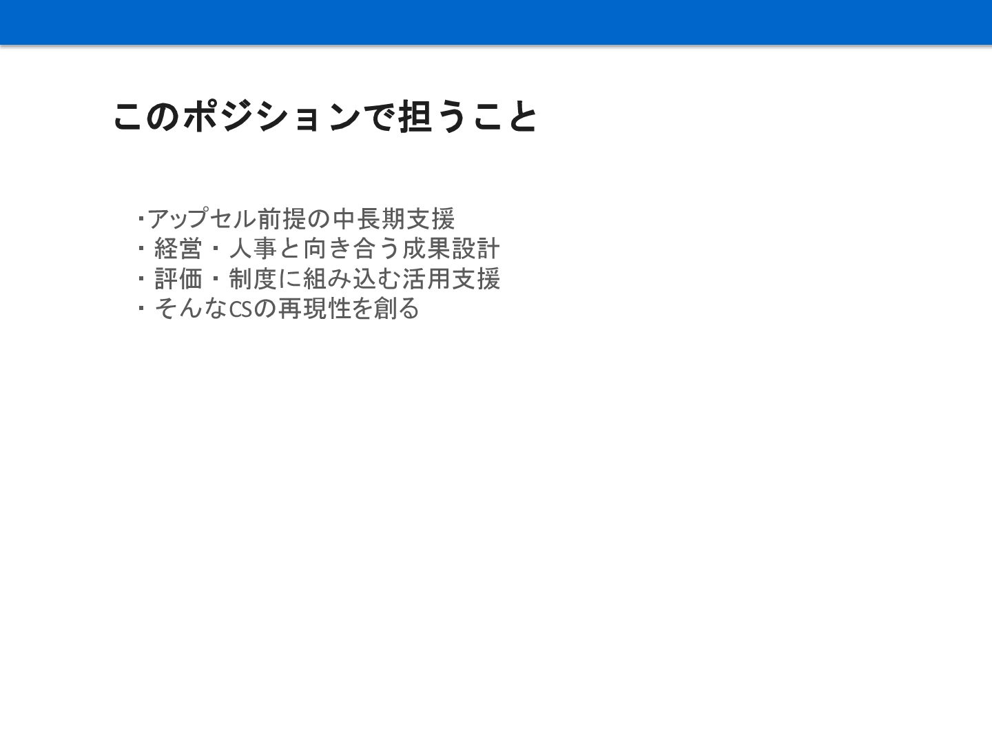 このポジションで担うこと ・アップセル前提の中長期支援 ・経営・人事と向き合う成果設計 ・評価・制度に組み込む活用支援 ・そんなCSの再現性を創る