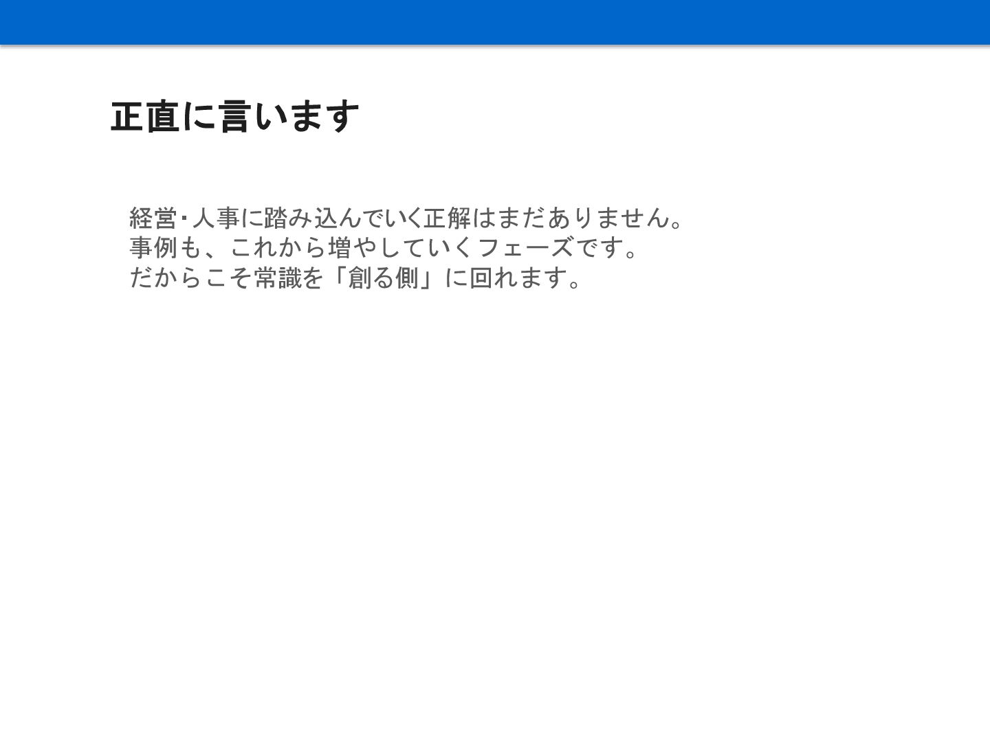 正直に言います 経営・人事に踏み込んでいく正解はまだありません。 事例も、これから増やしていくフェーズです。 だからこそ常識を「創る側」に回れます。