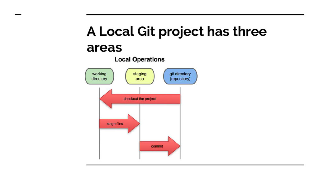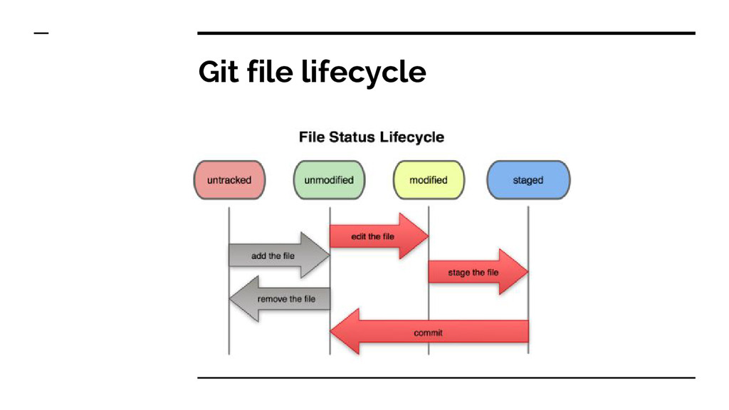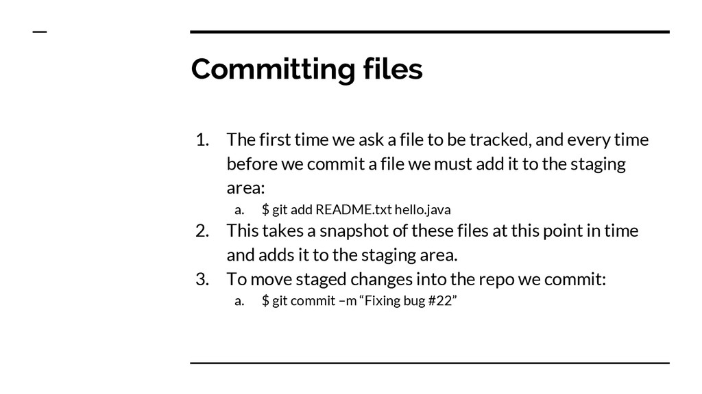 to be tracked, and every time before we commit a file we must add it to the staging area: a. $ git add README.txt hello.java 2. This takes a snapshot of these files at this point in time and adds it to the staging area. 3. To move staged changes into the repo we commit: a. $ git commit –m “Fixing bug #22”