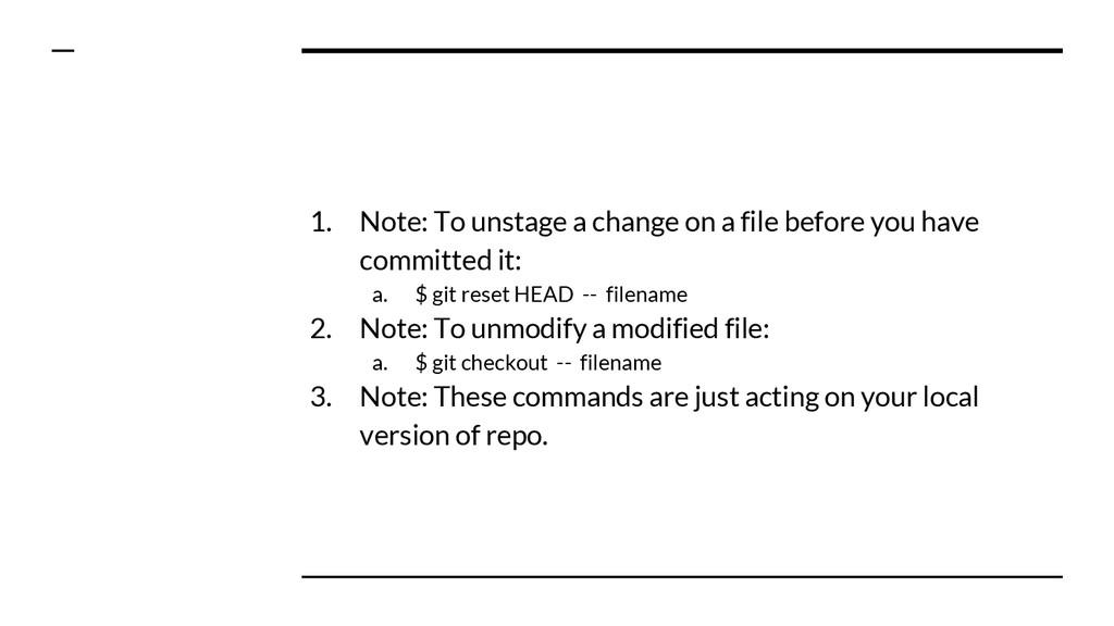 you have committed it: a. $ git reset HEAD -- filename 2. Note: To unmodify a modified file: a. $ git checkout -- filename 3. Note: These commands are just acting on your local version of repo.