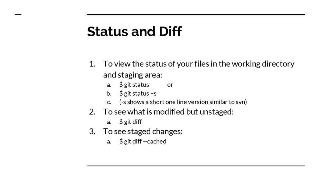 files in the working directory and staging area: a. $ git status or b. $ git status –s c. (-s shows a short one line version similar to svn) 2. To see what is modified but unstaged: a. $ git diff 3. To see staged changes: a. $ git diff --cached