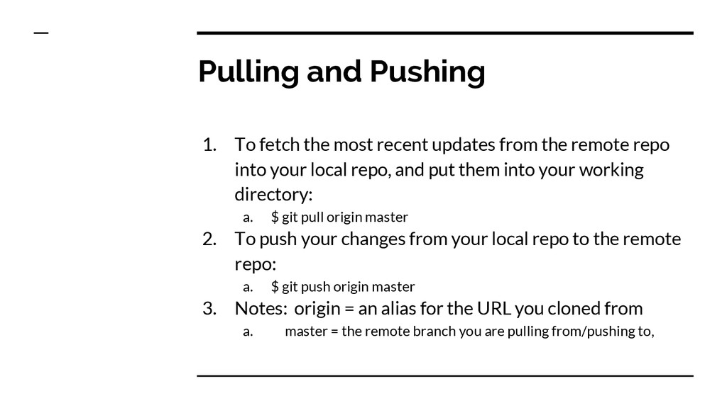 from the remote repo into your local repo, and put them into your working directory: a. $ git pull origin master 2. To push your changes from your local repo to the remote repo: a. $ git push origin master 3. Notes: origin = an alias for the URL you cloned from a. master = the remote branch you are pulling from/pushing to,