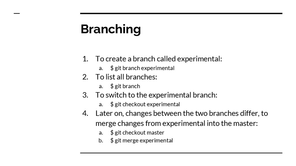 git branch experimental 2. To list all branches: a. $ git branch 3. To switch to the experimental branch: a. $ git checkout experimental 4. Later on, changes between the two branches differ, to merge changes from experimental into the master: a. $ git checkout master b. $ git merge experimental
