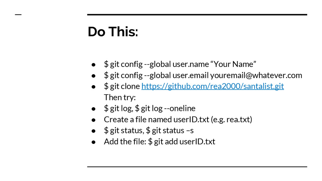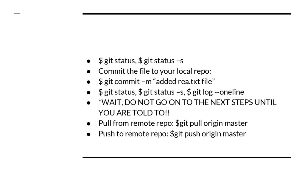the file to your local repo: • $ git commit –m “added rea.txt file” • $ git status, $ git status –s, $ git log --oneline • *WAIT, DO NOT GO ON TO THE NEXT STEPS UNTIL YOU ARE TOLD TO!! • Pull from remote repo: $git pull origin master • Push to remote repo: $git push origin master