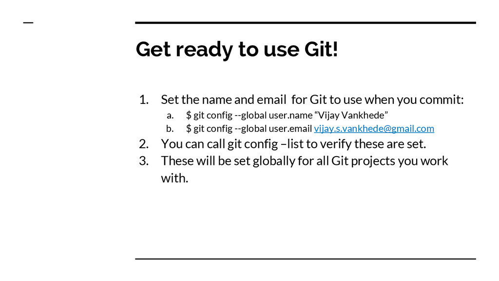 email for Git to use when you commit: a. $ git config --global user.name “Vijay Vankhede” b. $ git config --global user.email [email protected] 2. You can call git config –list to verify these are set. 3. These will be set globally for all Git projects you work with.