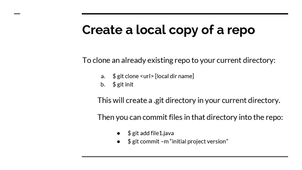 already existing repo to your current directory: a. $ git clone <url> [local dir name] b. $ git init This will create a .git directory in your current directory. Then you can commit files in that directory into the repo: • $ git add file1.java • $ git commit –m “initial project version”