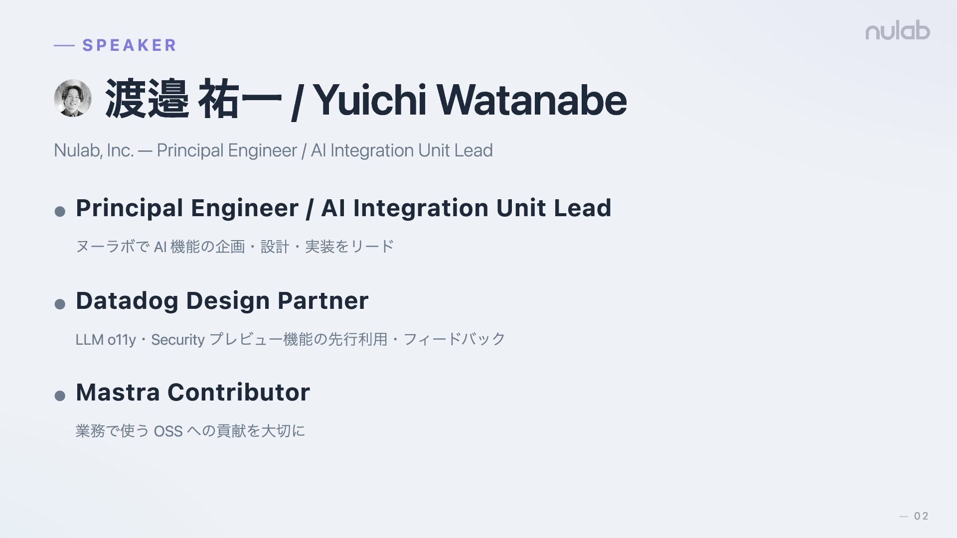 / AI Integration Unit Lead • Principal Engineer / AI Integration Unit Lead ヌーラボで AI 機能の企画・設計・実装をリード • Datadog Design Partner LLM o11y・Security プレビュー機能の先行利用・フィードバック • Mastra Contributor 業務で使う OSS への貢献を大切に SPEAKER 02 —
