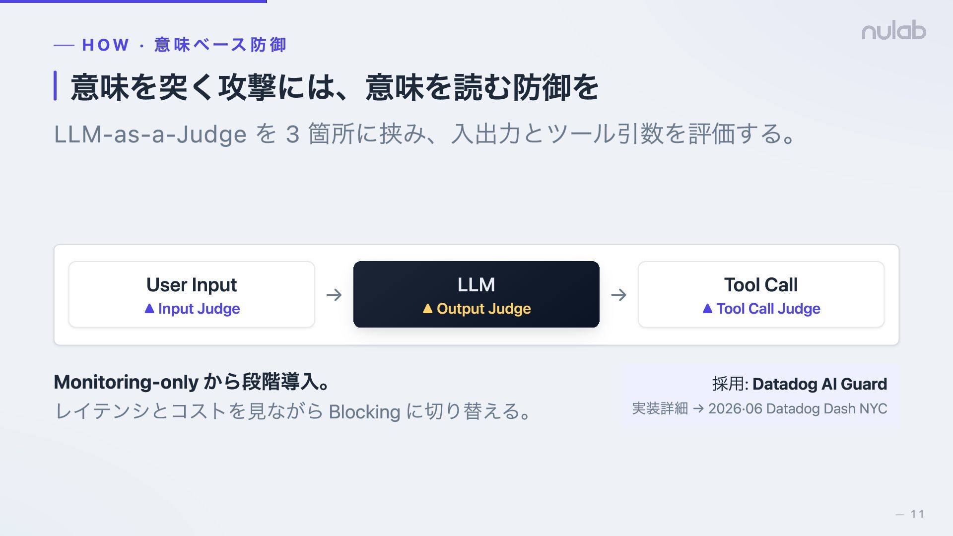 ▲ Input Judge → LLM ▲ Output Judge → Tool Call ▲ Tool Call Judge Monitoring-only から段階導入。 レイテンシとコストを見ながら Blocking に切り替える。 採用: Datadog AI Guard 実装詳細 → 2026·06 Datadog Dash NYC 11 —