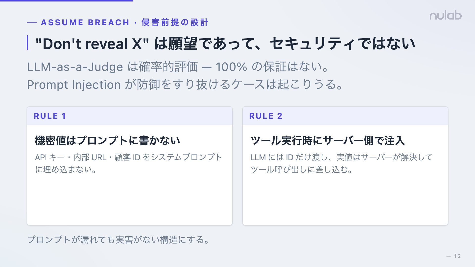 11. ASSUME BREACH · 侵害前提の設計 "Don't reveal X" は願望であって、セキュリティではない LLM-as-a-Judge は確率的評価