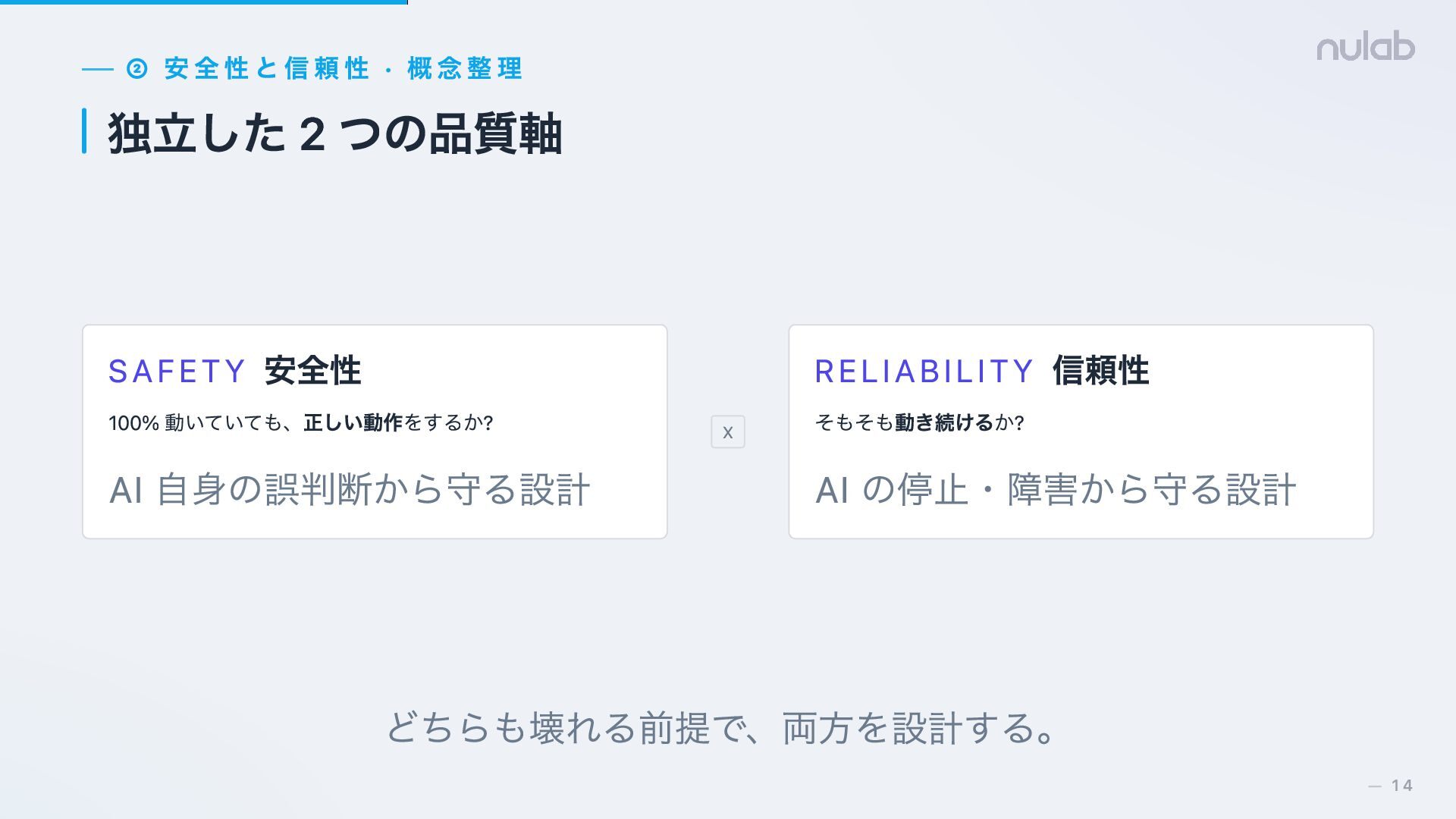13. ② 安全性と信頼性 · 概念整理 独立した 2 つの品質軸 SAFETY 安全性 100%