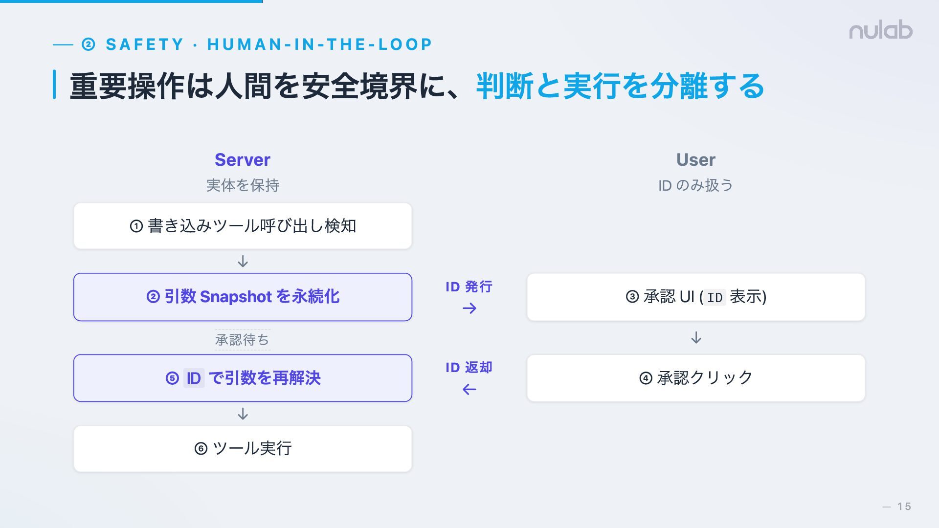 14. ② SAFETY · HUMAN-IN-THE-LOOP 重要操作は人間を安全境界に、判断と実行を分離する Server 実体を保持 User ID のみ扱う