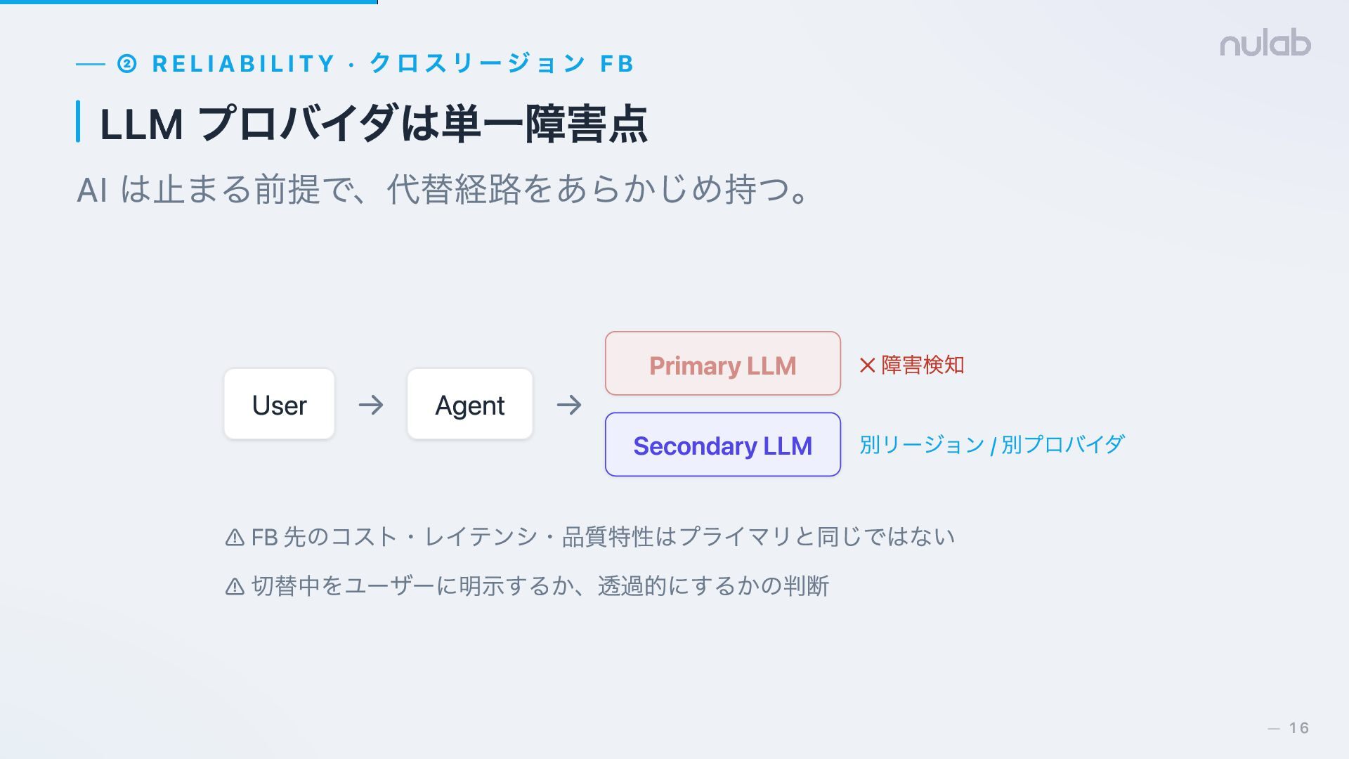 → Agent → ✕ 障害検知 Secondary LLM 別リージョン / 別プロバイダ ⚠ FB 先のコスト・レイテンシ・品質特性はプライマリと同じではない ⚠ 切替中をユーザーに明示するか、透過的にするかの判断 Primary LLM 16 —