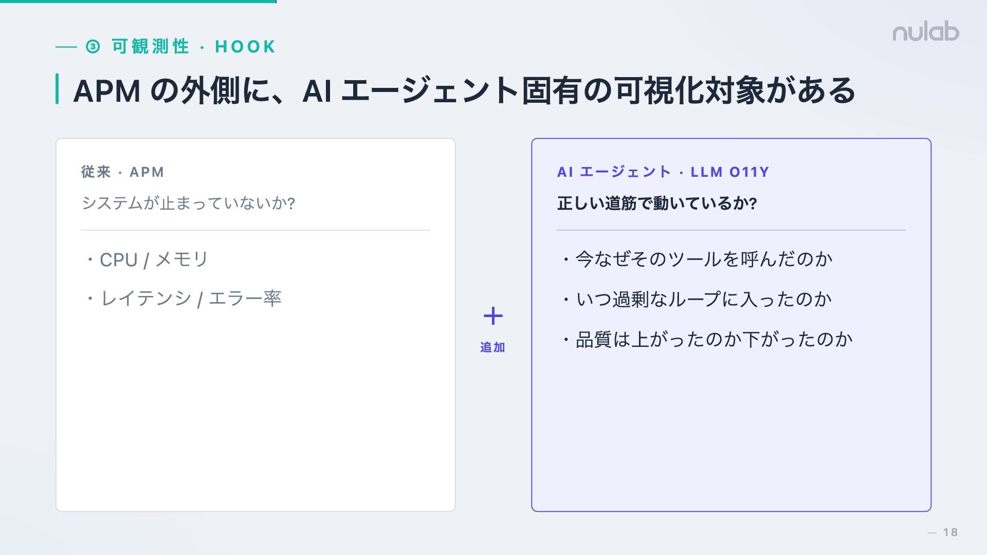 16. ③ 可観測性 · HOOK APM の外側に、AI エージェント固有の可視化対象がある 従来 · APM