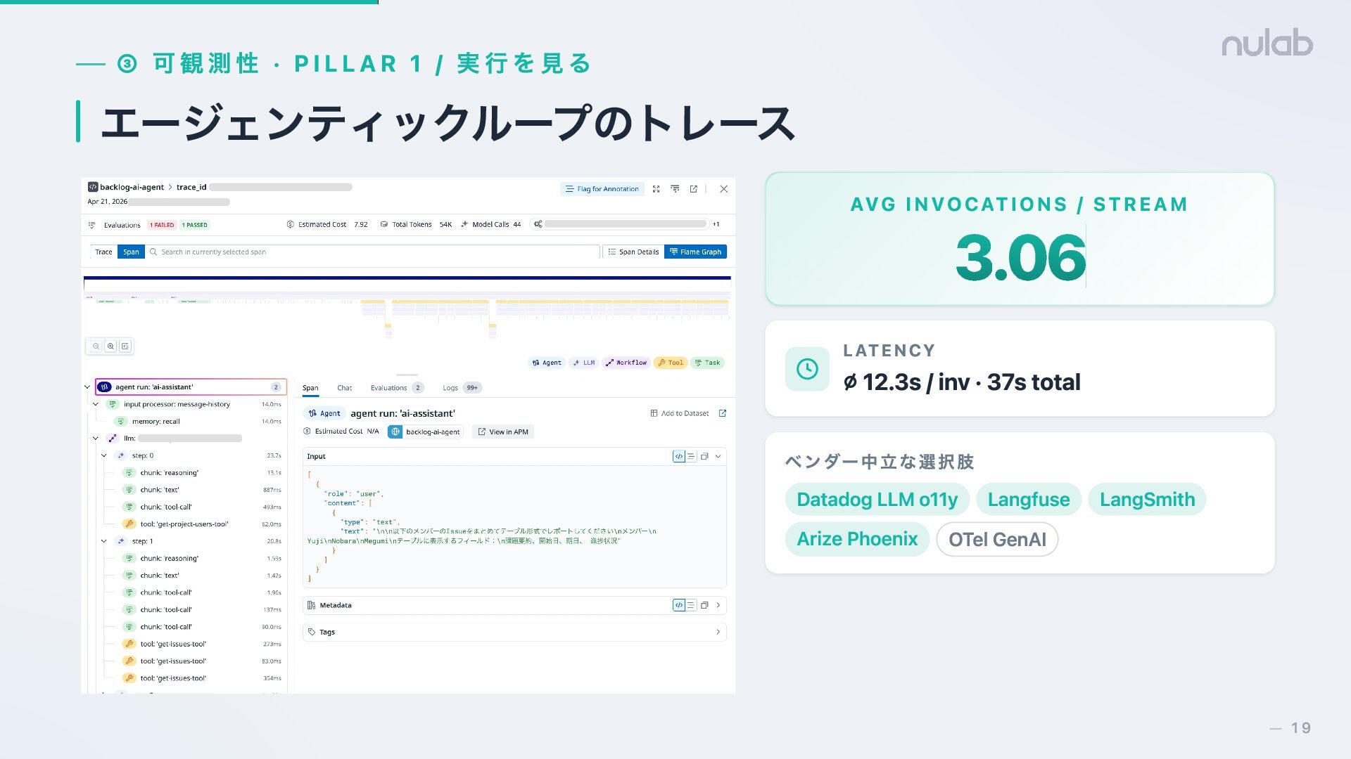 / STREAM 3.06 3.06 LATENCY ⌀ 12.3s / inv · 37s total ベンダー中立な選択肢 Datadog LLM o11y Langfuse LangSmith Arize Phoenix OTel GenAI 19 —