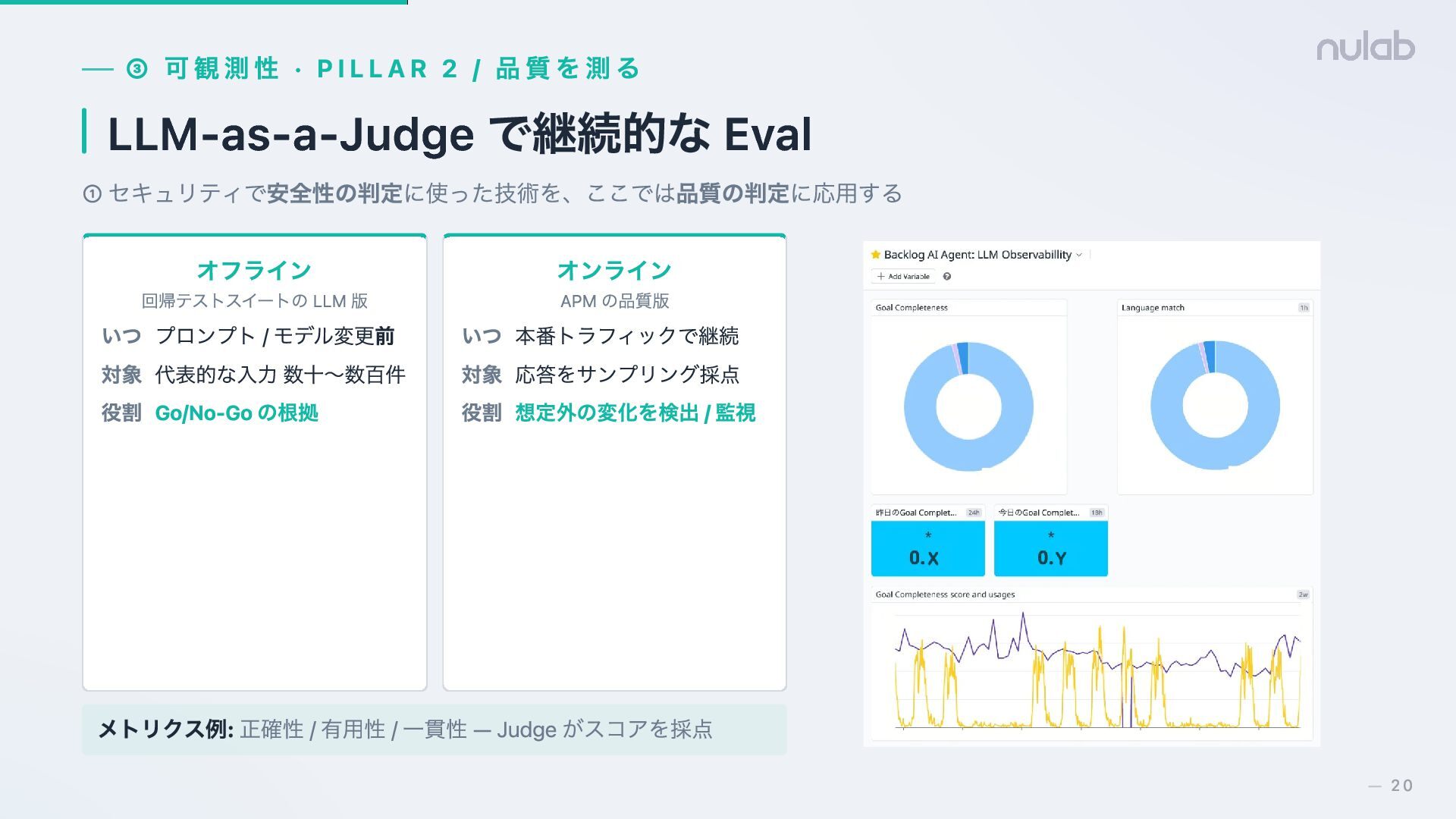 ① セキュリティで安全性の判定に使った技術を、ここでは品質の判定に応用する オフライン 回帰テストスイートの LLM 版 いつ プロンプト / モデル変更前 対象 代表的な入力 数十〜数百件 役割 Go/No-Go の根拠 オンライン APM の品質版 いつ 本番トラフィックで継続 対象 応答をサンプリング採点 役割 想定外の変化を検出 / 監視 メトリクス例: 正確性 / 有用性 / 一貫性 — Judge がスコアを採点 20 —