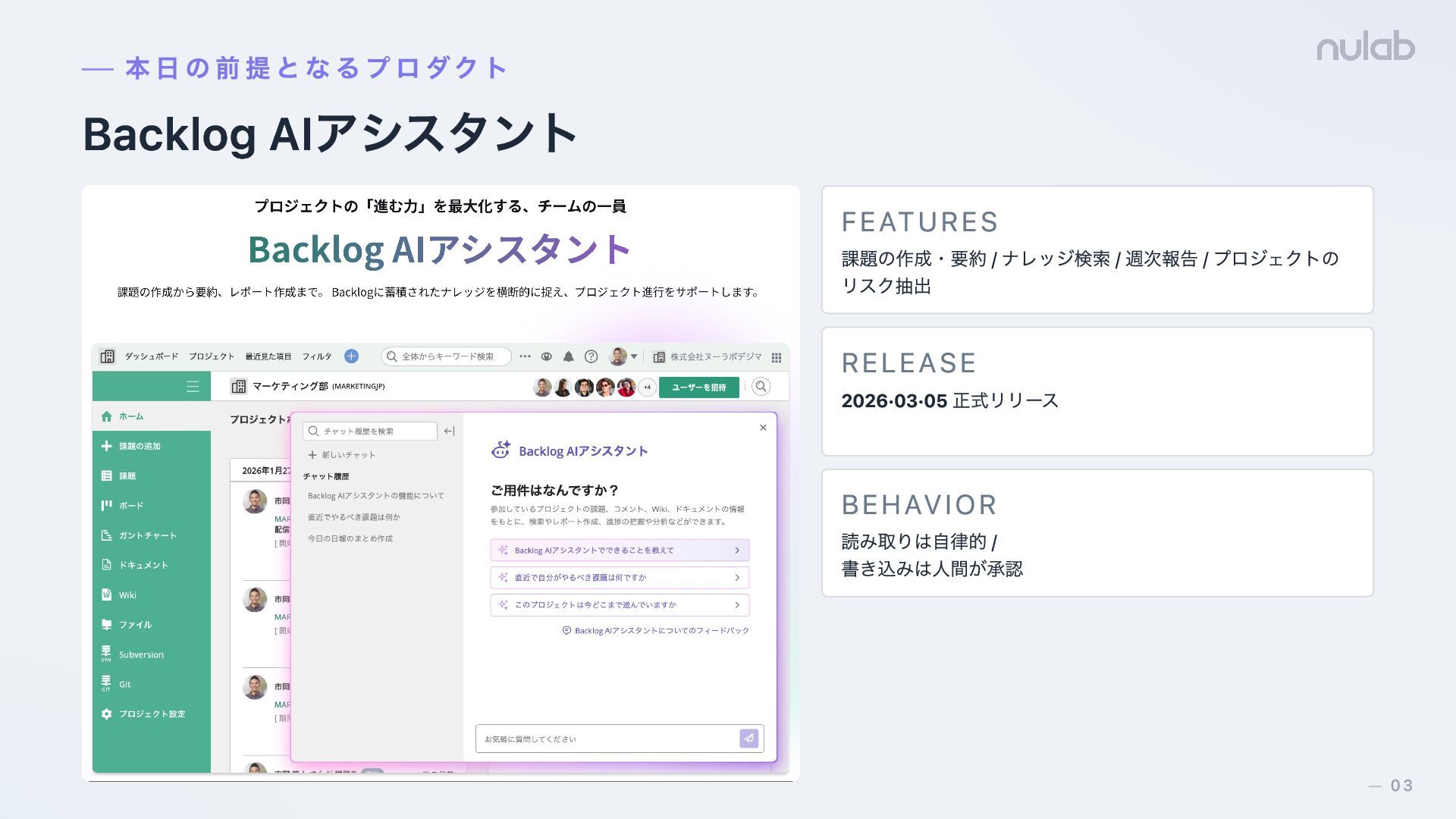 リスク抽出 RELEASE 2026·03·05 正式リリース BEHAVIOR 読み取りは自律的 / 書き込みは人間が承認 本日の前提となるプロダクト 03 —