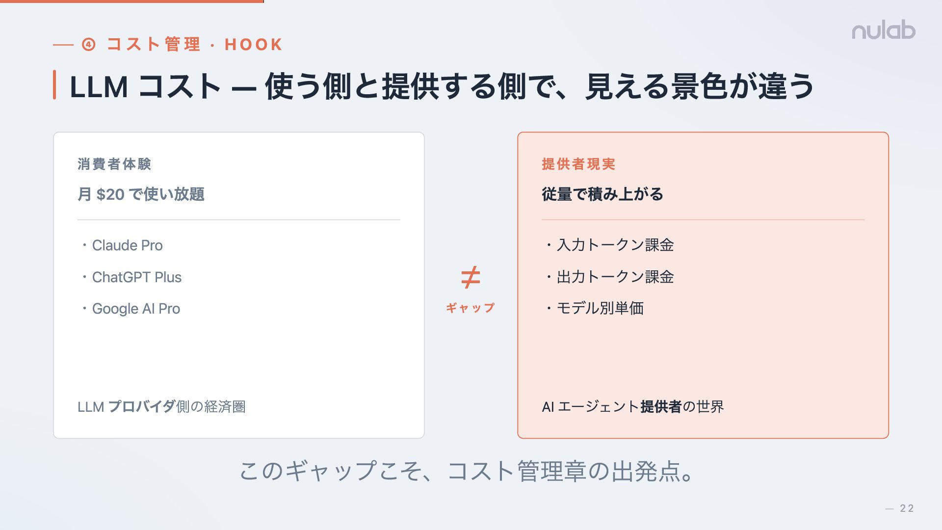 $20 で使い放題 ・Claude Pro ・ChatGPT Plus ・Google AI Pro LLM プロバイダ側の経済圏 ≠ ギャップ 提供者現実 従量で積み上がる ・入力トークン課金 ・出力トークン課金 ・モデル別単価 AI エージェント提供者の世界 このギャップこそ、コスト管理章の出発点。 22 —