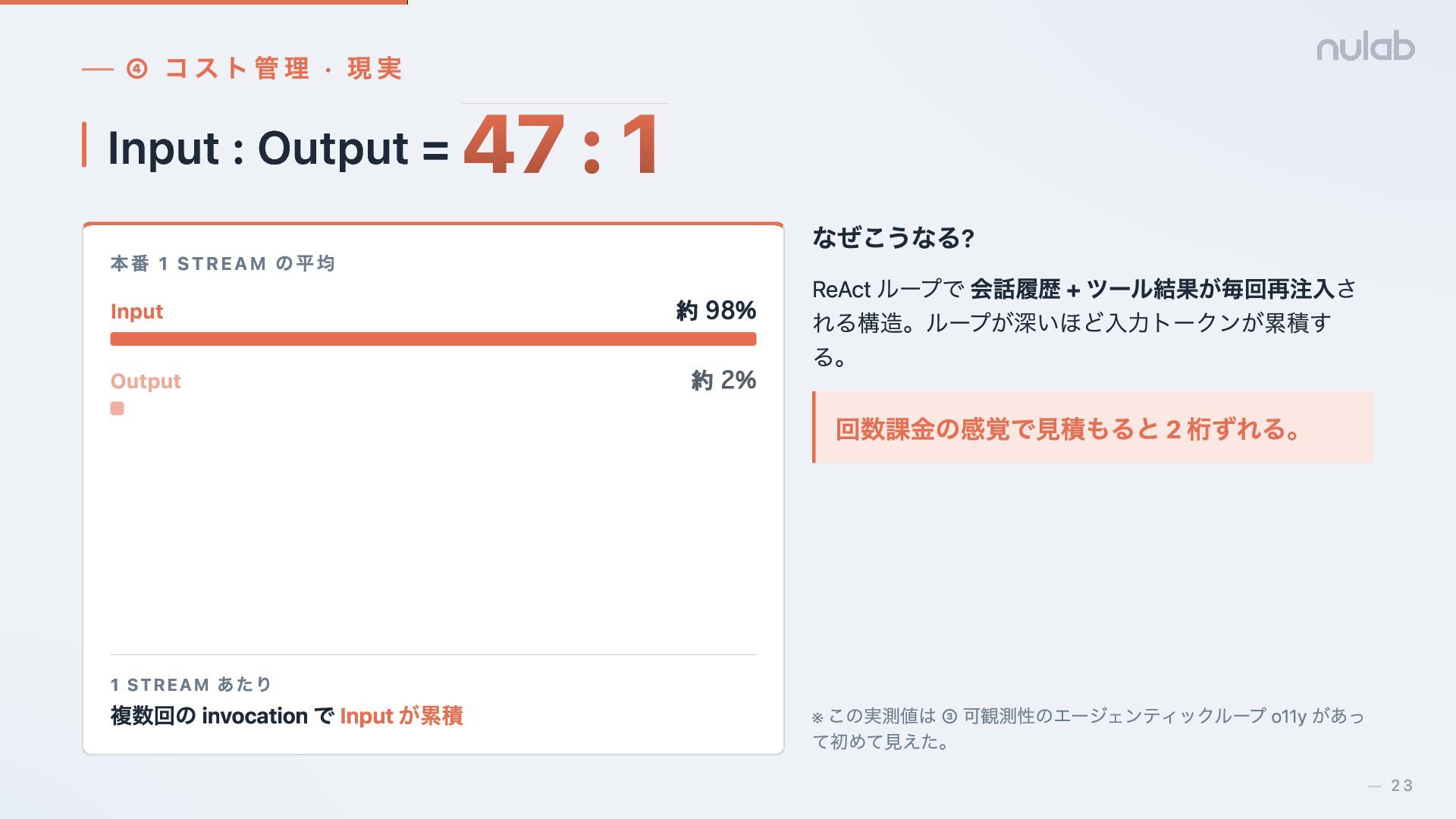 1 47 : 1 本番 1 STREAM の平均 Input 約 98% 1 STREAM あたり 複数回の invocation で Input が累積 なぜこうなる? ReAct ループで 会話履歴 + ツール結果が毎回再注入さ れる構造。ループが深いほど入力トークンが累積す る。 回数課金の感覚で見積もると 2 桁ずれる。 ※ この実測値は ③ 可観測性のエージェンティックループ o11y があっ て初めて見えた。 Output 約 2% 23 —