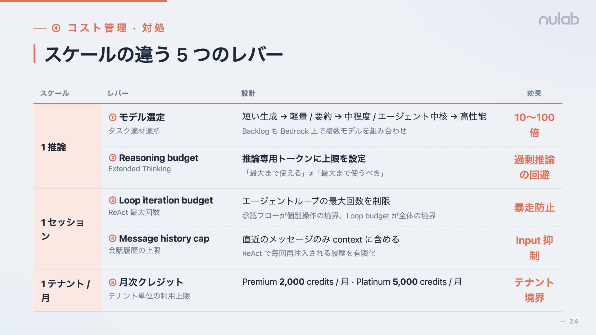 効果 1 推論 ① モデル選定 タスク適材適所 短い生成 → 軽量 / 要約 → 中程度 / エージェント中核 → 高性能 Backlog も Bedrock 上で複数モデルを組み合わせ 10〜100 倍 ② Reasoning budget Extended Thinking 推論専用トークンに上限を設定 「最大まで使える」≠「最大まで使うべき」 過剰推論 の回避 1 セッショ ン ③ Loop iteration budget ReAct 最大回数 エージェントループの最大回数を制限 承認フローが個別操作の境界、Loop budget が全体の境界 暴走防止 ④ Message history cap 会話履歴の上限 直近のメッセージのみ context に含める ReAct で毎回再注入される履歴を有限化 Input 抑 制 1 テナント / 月 ⑤ 月次クレジット テナント単位の利用上限 Premium 2,000 credits / 月 · Platinum 5,000 credits / 月 テナント 境界 24 —
