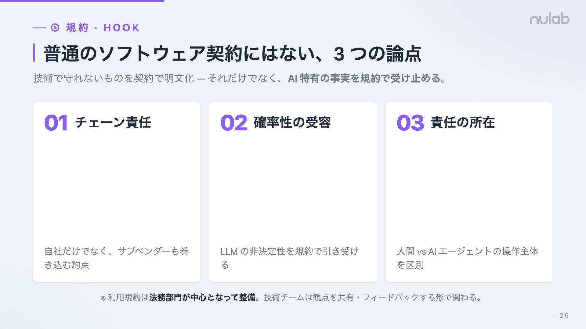 24. ⑤ 規約 · HOOK 普通のソフトウェア契約にはない、3 つの論点 技術で守れないものを契約で明文化 — それだけでなく、AI 特有の事実を規約で受け止める。