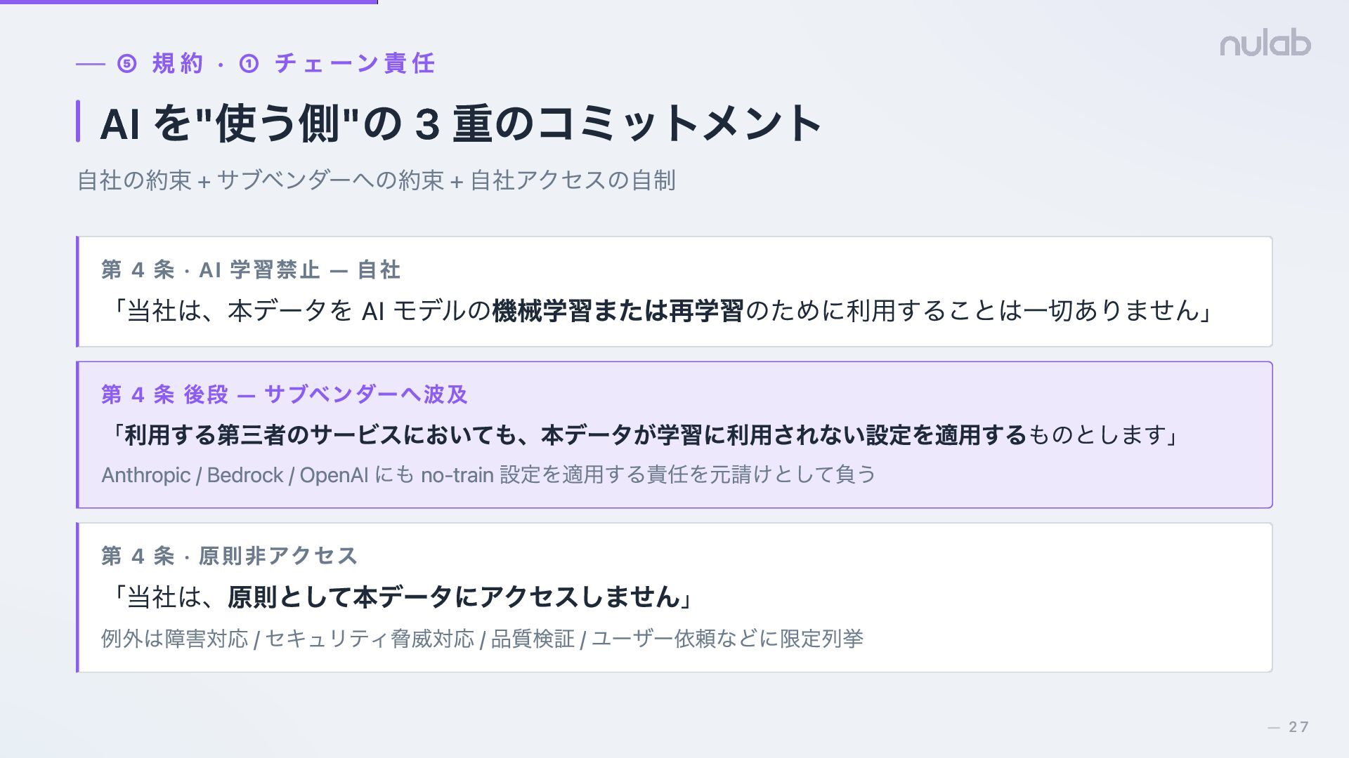 + サブベンダーへの約束 + 自社アクセスの自制 第 4 条 · AI 学習禁止 — 自社 「当社は、本データを AI モデルの機械学習または再学習のために利用することは一切ありません」 第 4 条 後段 — サブベンダーへ波及 「利用する第三者のサービスにおいても、本データが学習に利用されない設定を適用するものとします」 Anthropic / Bedrock / OpenAI にも no-train 設定を適用する責任を元請けとして負う 第 4 条 · 原則非アクセス 「当社は、原則として本データにアクセスしません」 例外は障害対応 / セキュリティ脅威対応 / 品質検証 / ユーザー依頼などに限定列挙 27 —