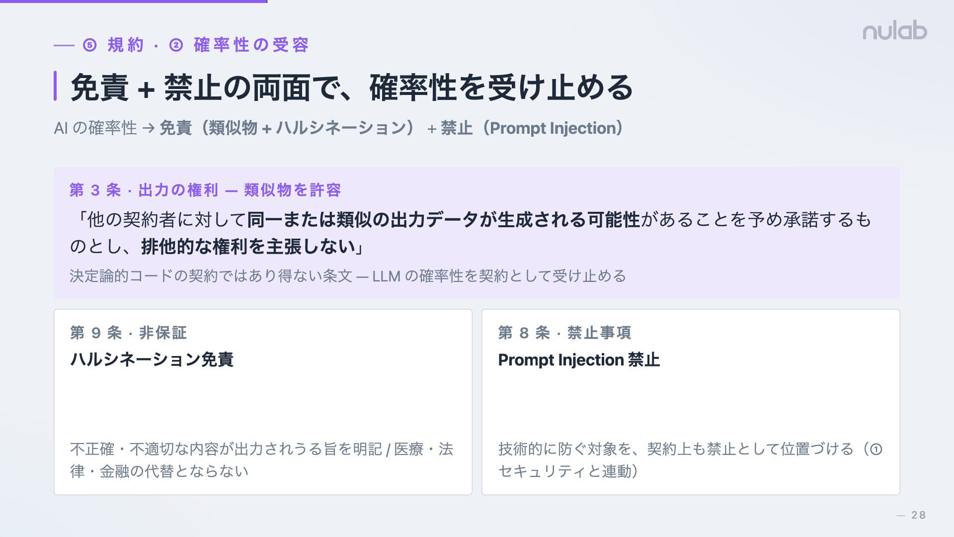 → 免責(類似物 + ハルシネーション) + 禁止(Prompt Injection) 第 3 条 · 出力の権利 — 類似物を許容 「他の契約者に対して同一または類似の出力データが生成される可能性があることを予め承諾するも のとし、排他的な権利を主張しない」 決定論的コードの契約ではあり得ない条文 — LLM の確率性を契約として受け止める 第 9 条 · 非保証 ハルシネーション免責 不正確・不適切な内容が出力されうる旨を明記 / 医療・法 律・金融の代替とならない 第 8 条 · 禁止事項 Prompt Injection 禁止 技術的に防ぐ対象を、契約上も禁止として位置づける(① セキュリティと連動) 28 —