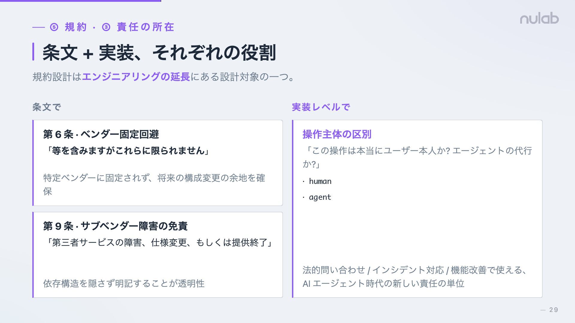 第 6 条 · ベンダー固定回避 「等を含みますがこれらに限られません」 特定ベンダーに固定されず、将来の構成変更の余地を確 保 第 9 条 · サブベンダー障害の免責 「第三者サービスの障害、仕様変更、もしくは提供終了」 依存構造を隠さず明記することが透明性 実装レベルで 操作主体の区別 「この操作は本当にユーザー本人か? エージェントの代行 か?」 · human · agent 法的問い合わせ / インシデント対応 / 機能改善で使える、 AI エージェント時代の新しい責任の単位 29 —