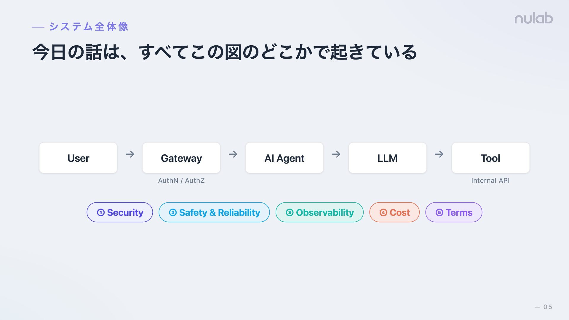 → LLM → Tool Internal API ① Security ② Safety & Reliability ③ Observability ④ Cost ⑤ Terms システム全体像 05 —