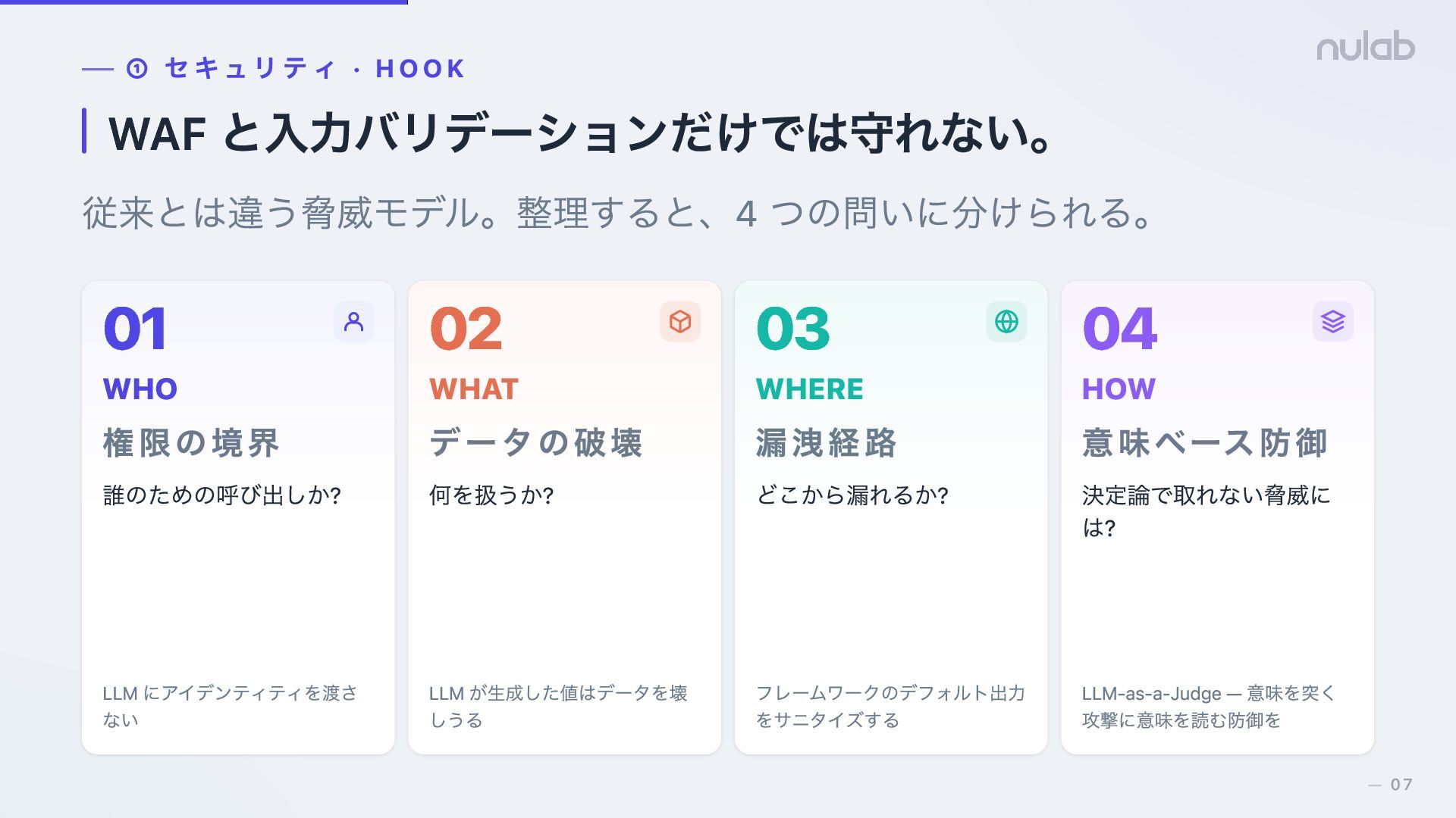 誰のための呼び出しか? LLM にアイデンティティを渡さ ない 01 WHAT データの破壊 何を扱うか? LLM が生成した値はデータを壊 しうる 02 WHERE 漏洩経路 どこから漏れるか? フレームワークのデフォルト出力 をサニタイズする 03 HOW 意味ベース防御 決定論で取れない脅威に は? LLM-as-a-Judge — 意味を突く 攻撃に意味を読む防御を 04 07 —