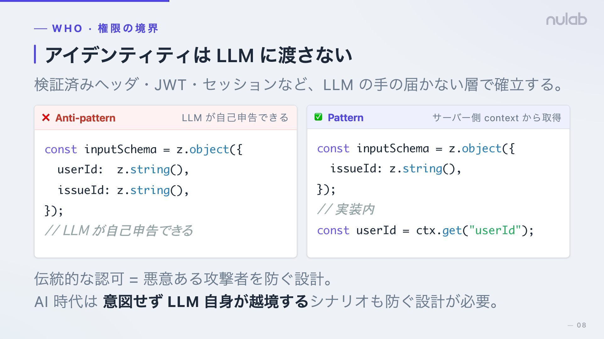 7. WHO · 権限の境界 アイデンティティは LLM に渡さない 検証済みヘッダ・JWT・セッションなど、LLM の手の届かない層で確立する。 ❌ Anti-pattern