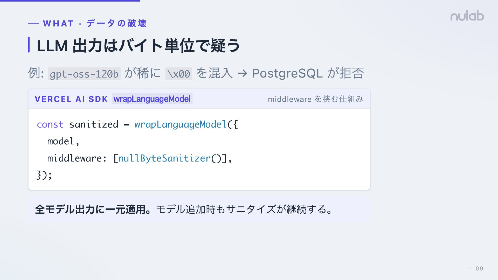 → PostgreSQL が拒否 VERCEL AI SDK wrapLanguageModel middleware を挟む仕組み const sanitized = wrapLanguageModel({ model, middleware: [nullByteSanitizer()], }); 全モデル出力に一元適用。モデル追加時もサニタイズが継続する。 09 —
