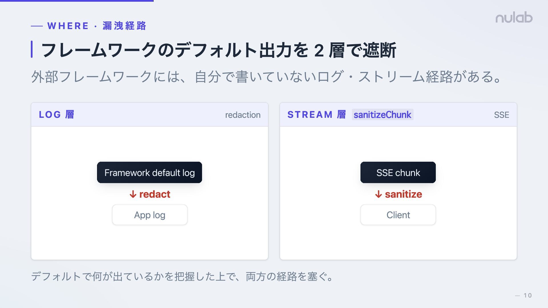 Framework default log ↓ redact App log STREAM 層 sanitizeChunk SSE SSE chunk ↓ sanitize Client デフォルトで何が出ているかを把握した上で、両方の経路を塞ぐ。 10 —