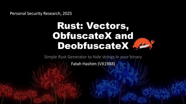 follow the instructions for your platform OS! oRun it and select option 1 (proceed with installation) oMake sure you can run rustup and cargo from your terminal, after installation oThree toolchains available at any time. ▪ Stable, Beta, Nightly ▪ Stable installed initially by default • OR (Web Browser Compiler) Rust Playground. • (Optional) Disassembler / Decompiler Tool. • Internet connection. Personal Security Research ― Fatah Hashim (VX1988) | VX Engineering