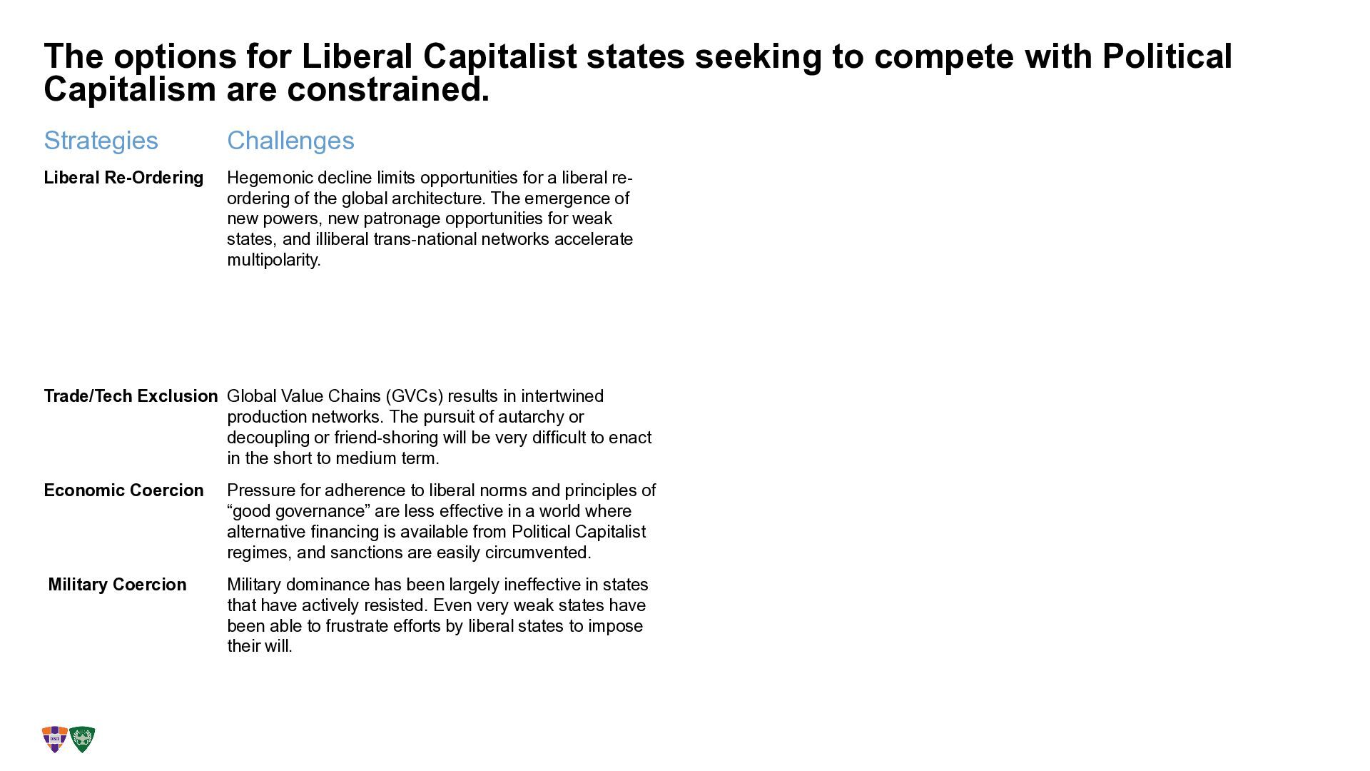 with Political Capitalism are constrained. Global Value Chains (GVCs) results in intertwined production networks. The pursuit of autarchy or decoupling or friend-shoring will be very difficult to enact in the short to medium term. Hegemonic decline limits opportunities for a liberal re- ordering of the global architecture. The emergence of new powers, new patronage opportunities for weak states, and illiberal trans-national networks accelerate multipolarity. Pressure for adherence to liberal norms and principles of “good governance” are less effective in a world where alternative financing is available from Political Capitalist regimes, and sanctions are easily circumvented. Challenges Trade/Tech Exclusion Liberal Re-Ordering Economic Coercion Military Coercion Military dominance has been largely ineffective in states that have actively resisted. Even very weak states have been able to frustrate efforts by liberal states to impose their will.