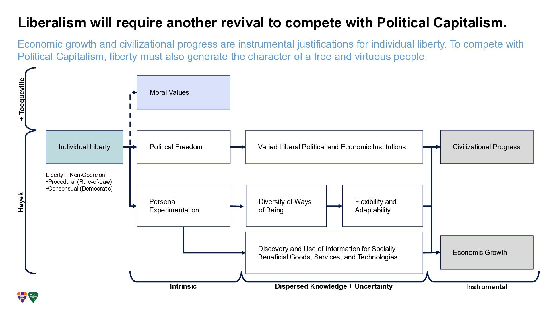 liberty. To compete with Political Capitalism, liberty must also generate the character of a free and virtuous people. Liberalism will require another revival to compete with Political Capitalism. Individual Liberty Political Freedom Personal Experimentation Civilizational Progress Discovery and Use of Information for Socially Beneficial Goods, Services, and Technologies Flexibility and Adaptability Varied Liberal Political and Economic Institutions Moral Values Diversity of Ways of Being Economic Growth Hayek + Tocqueville Liberty = Non-Coercion •Procedural (Rule-of-Law) •Consensual (Democratic) Dispersed Knowledge + Uncertainty Intrinsic Instrumental