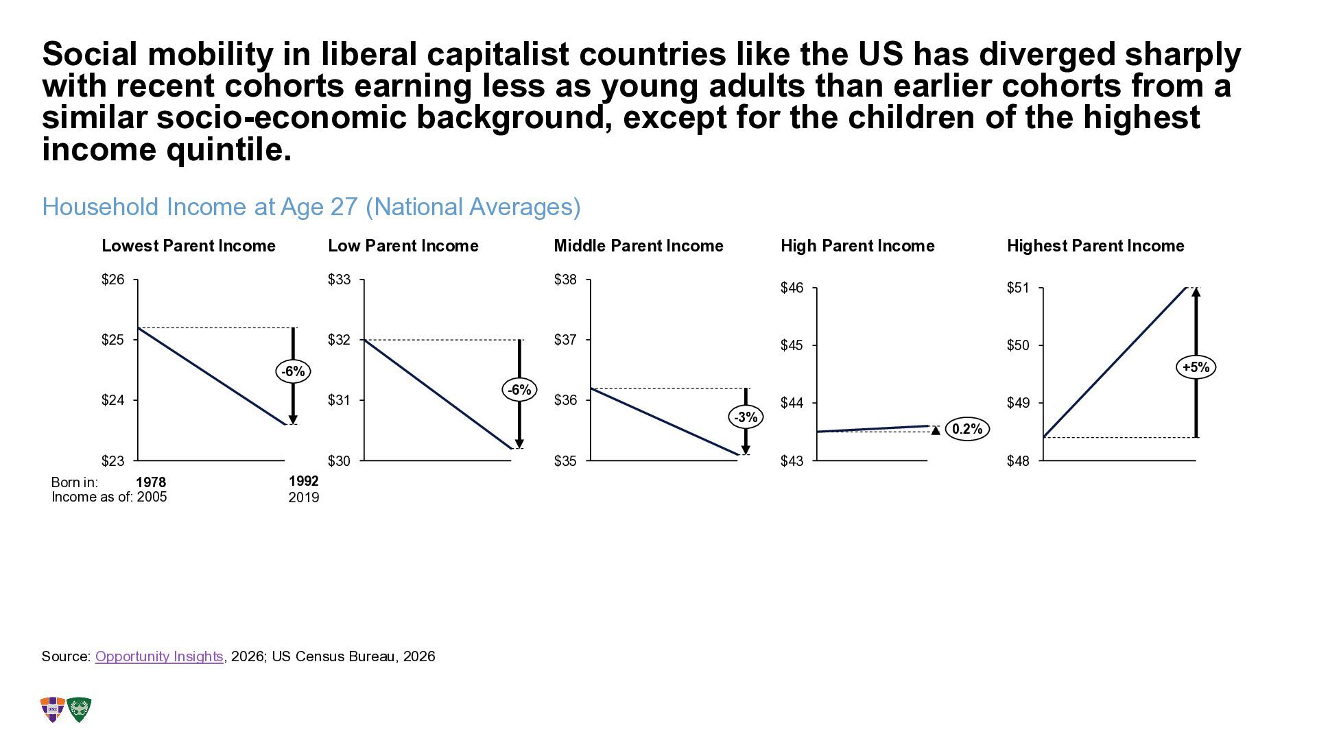 liberal capitalist countries like the US has diverged sharply with recent cohorts earning less as young adults than earlier cohorts from a similar socio-economic background, except for the children of the highest income quintile. $23 $24 $25 $26 -6% Income as of: 2005 Born in: 1978 2019 $30 $31 $32 $33 -6% $35 $36 $37 $38 -3% $43 $44 $45 $46 0.2% $48 $49 $50 $51 +5% Lowest Parent Income Low Parent Income Middle Parent Income High Parent Income Highest Parent Income 1992 Source: Opportunity Insights, 2026; US Census Bureau, 2026