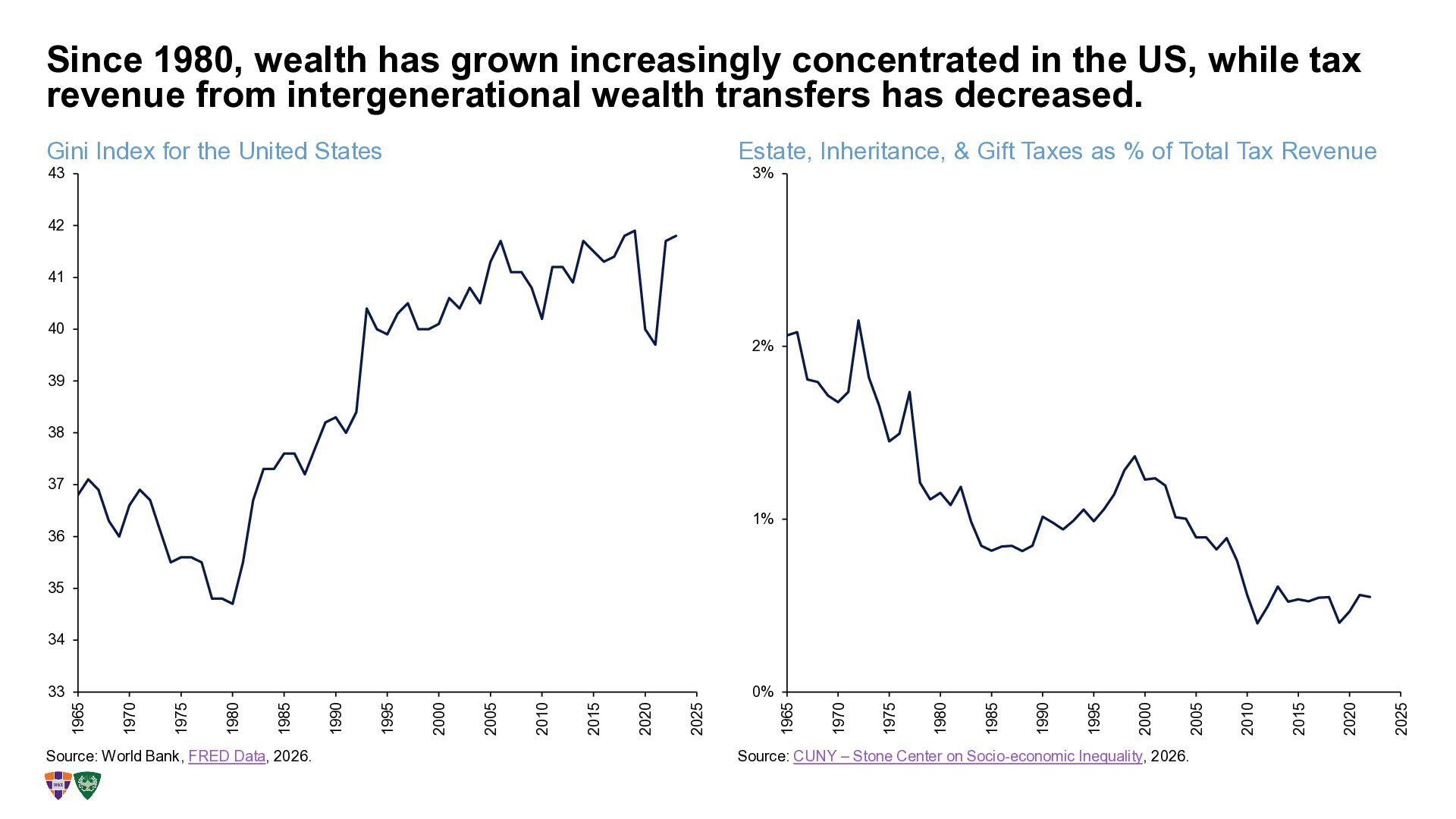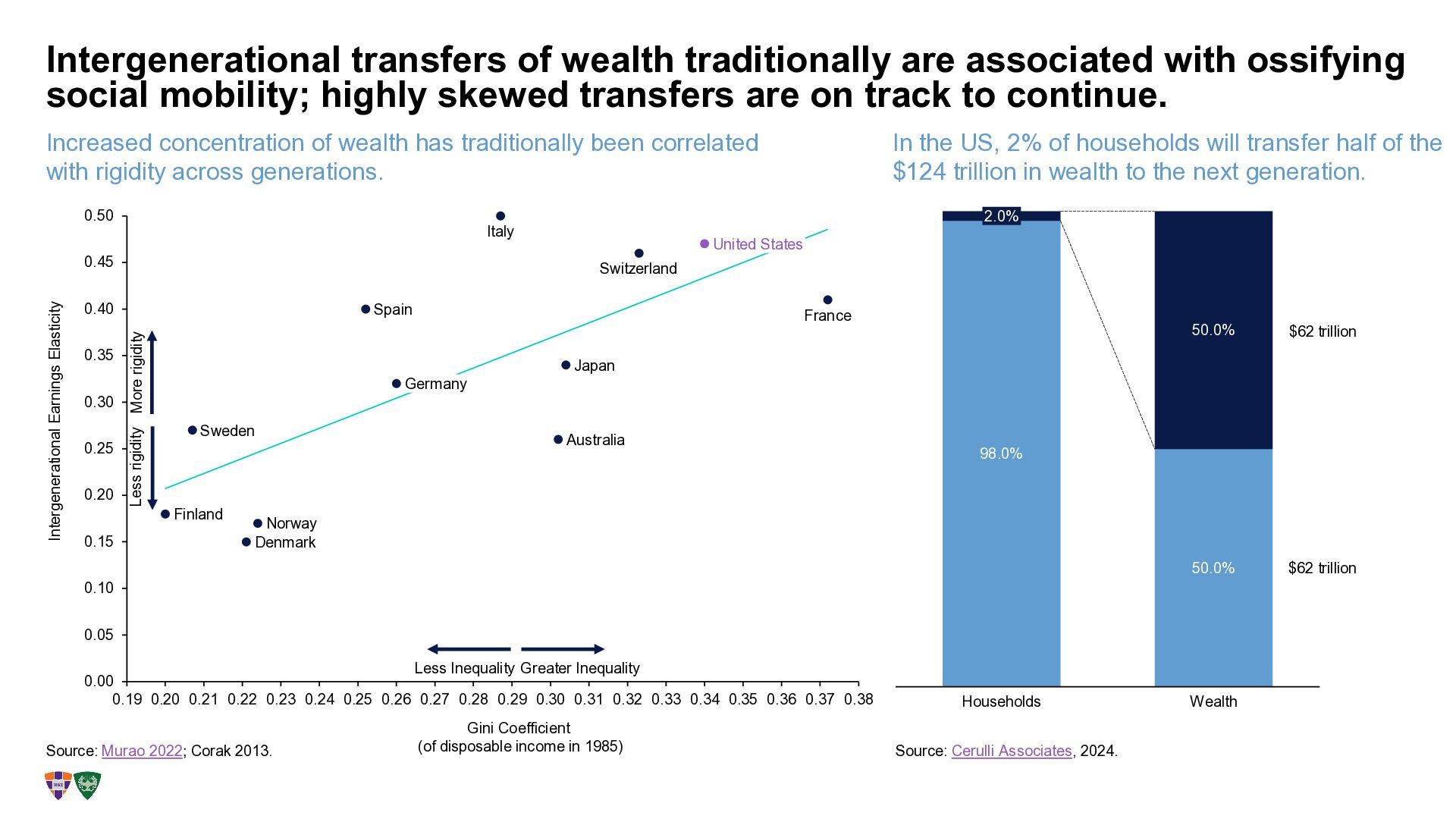 the $124 trillion in wealth to the next generation. Intergenerational transfers of wealth traditionally are associated with ossifying social mobility; highly skewed transfers are on track to continue. 98.0% 50.0% 50.0% 2.0% Households Wealth $62 trillion $62 trillion Source: Cerulli Associates, 2024. 0.00 0.05 0.10 0.15 0.20 0.25 0.30 0.35 0.40 0.45 0.50 0.19 0.20 0.21 0.22 0.23 0.24 0.25 0.26 0.27 0.28 0.29 0.30 0.31 0.32 0.33 0.34 0.35 0.36 0.37 0.38 Australia Switzerland Germany Denmark Spain Finland France Italy Japan Norway Sweden United States Gini Coefficient (of disposable income in 1985) Intergenerational Earnings Elasticity Increased concentration of wealth has traditionally been correlated with rigidity across generations. More rigidity Less rigidity Greater Inequality Less Inequality Source: Murao 2022; Corak 2013.